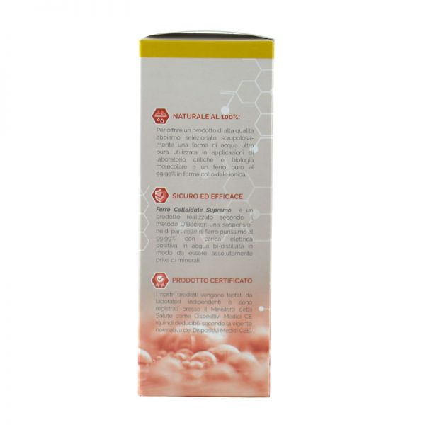 Il Ferro Colloidale Ionico è una sospensione liquida di particelle di FERRO PURISSIMO al 99,99% con carica elettrica positiva, sospese in ACQUA BI-DISTILLATA totalmente priva di minerali. Proprio la qualità superiore dei suoi componenti lo rende un prodotto SICURO per l’organismo. Sebbene fino ad ora l’integrazione del ferro sia sempre avvenuta in maniera ponderale, l’assunzione di ferro in forma colloidale ionica risulta più EFFICACE perché in questo modo il ferro permea più facilmente le mucose orali: è assorbito in misura maggiore ed è immediatamente disponibile al 100% per l’organismo.